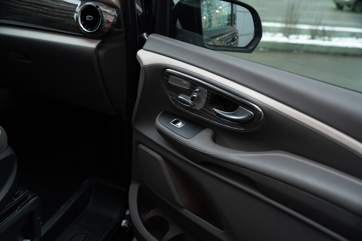 - Отделка натуральной кожей и шпоном дерева задней части салона